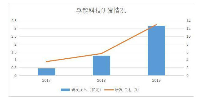 研發(fā)方面,孚能科技報告期內(nèi)研發(fā)投入大幅度提高,投入金額分別為0.47億元、1.27億元、3.18億元,復合增長率達到160.11%。研發(fā)占比也由2017年的3.54%增長到2019年的12.99%,漲幅超過9個百分點,具體情況如下: