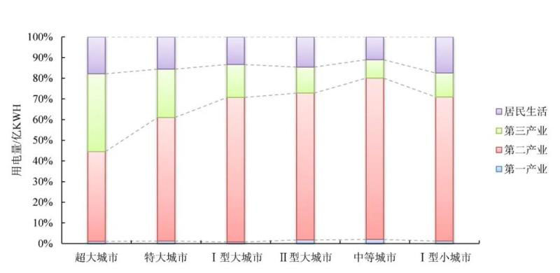 (3)超大城市用電結(jié)構(gòu)已接近發(fā)達(dá)國家水平,結(jié)構(gòu)調(diào)整效果顯著,其他類型城市第三產(chǎn)業(yè)占比仍較低,第二產(chǎn)業(yè)占據(jù)明顯主導(dǎo)地位。