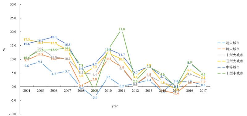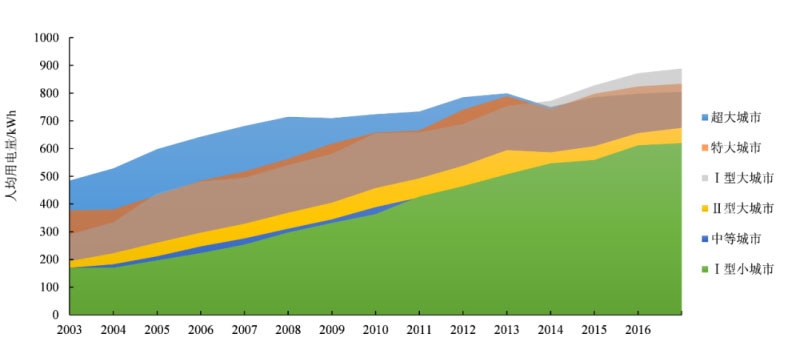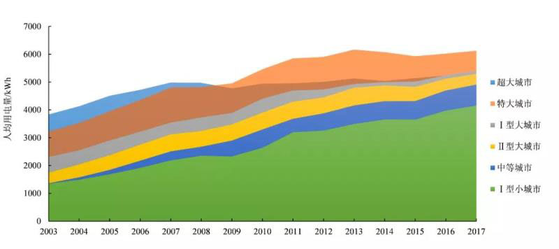 具體通過各類型城市人均用電量增速來看,超大城市的用電增速在各城市類型里是最低的,其次是特大城市,Ⅰ型大城市、Ⅱ型大城市、中等城市、Ⅰ型小城市的用電增速基本呈逐類型城市升高的趨勢(shì),其中Ⅰ型小城市的用電量波動(dòng)幅度最大。各類型城市2003-2017年的用電量平均增速分別為2.3%、4.7%、6.2%、8.3%、9.6%、8.4%。