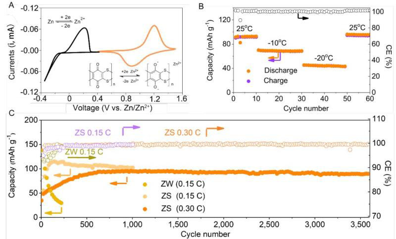 ▲圖5. PDB/Zn電池的電化學(xué)性能。(A)ZS電解質(zhì)的CV曲線(掃速為1 mV s?1)以及組裝的PDB/ZS/Zn電池的CV曲線 (黑色為金屬鋅沉積溶解的曲線,橘黃色為PDB正極的CV曲線,插圖為PDB結(jié)構(gòu)以及反應(yīng)機(jī)理)。(B)PDB/ZS/Zn電池在室溫和低溫下的電化學(xué)表征。(C)PDB/Zn電池在ZW(0.15 C)電解質(zhì)以及在ZS電解質(zhì)中(0.15 C和0.30 C)的充放電循環(huán)行為。