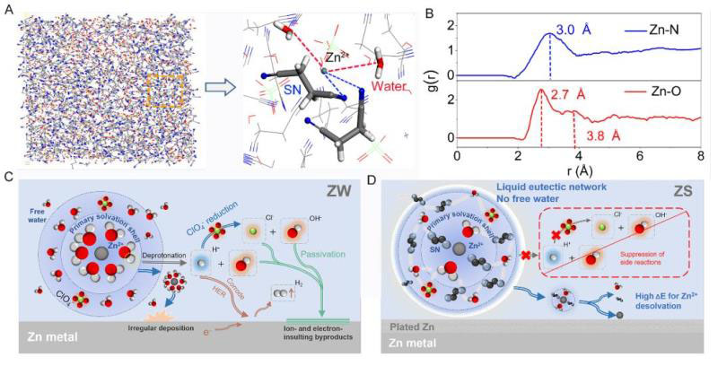 ▲圖4. ZS理論計(jì)算以及ZS和ZW電解質(zhì)的結(jié)構(gòu)示意圖(A)ZS電解質(zhì)的MD理論計(jì)算優(yōu)化結(jié)構(gòu)及(B)ZS電解質(zhì)中的Zn2+-N和Zn2+-O的RDFs,(C)ZW和(D)ZS電解質(zhì)的溶劑化結(jié)構(gòu)以及界面反應(yīng)機(jī)理示意圖。