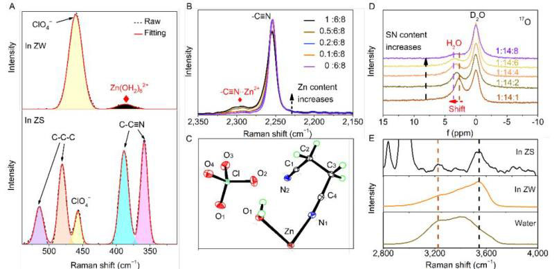 ▲圖3. ZS和ZW電解質(zhì)的結(jié)構(gòu)表征(A)ZW和ZS電解質(zhì)的拉曼譜。(B)在2350?2150 cm ?1范圍內(nèi),不同比例的Zn(ClO4)2/H2O/SN混合物的拉曼譜。(C)在ZS電解質(zhì)中獲得的單晶結(jié)構(gòu)。(D)不同摩爾比Zn(ClO4)2/H2O/SN混合物中水分子中17O的化學(xué)位移。(E)水、ZS和ZW的拉曼譜。