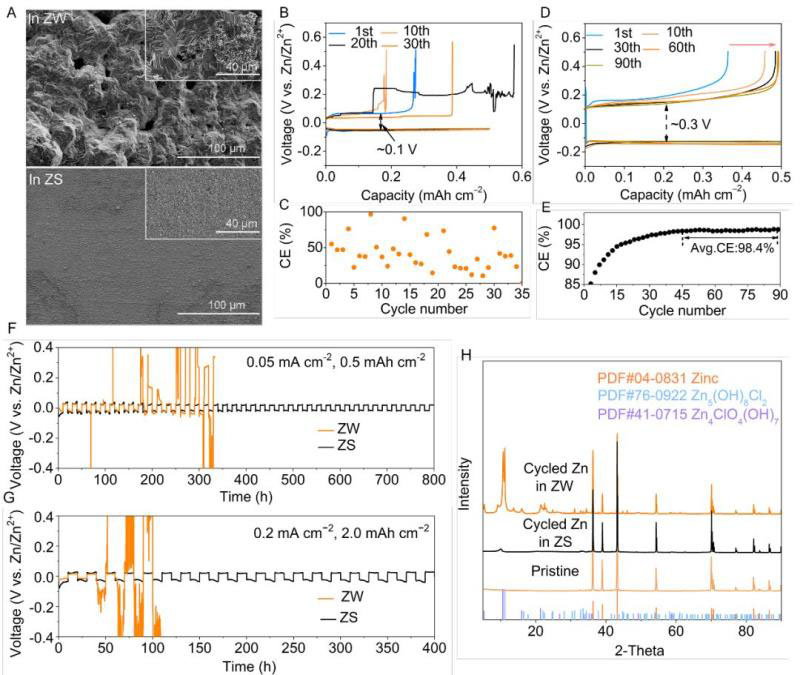▲圖2. ZW和ZS電解質(zhì)的金屬鋅的沉積溶解行為。(A)在-0.3 V的條件下,在不銹鋼(SS)上沉積0.5 h后金屬鋅的SEM圖。恒電流條件下(B,C)ZW和(D,E)ZS的庫倫效率(電流密度為0.5 mA cm?2;面容量為0.5 mAh cm?2)。對(duì)稱電池分別在(F)0.05 mA cm?2 及(G)0.2 mA cm?2條件下的恒電流充放電曲線。(H)循環(huán)后鋅片的XRD表征。