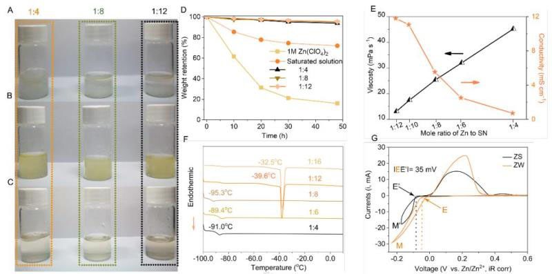 ▲圖1.電解液的制備以及表征。(A) Zn(SO4)2?7H2O,(B) Zn(NO3)2?6H2O 和 (C) Zn(ClO4)2?6H2O分別在SN中的溶解狀態(tài) (從左到右鋅鹽和SN的摩爾比分別為1:4,1:8和1:12),(D)不同電解質(zhì)的質(zhì)量在空氣中的變化 (25 oC)。(E) 不同摩爾比的Zn(ClO4)2?6H2O/SN的電導(dǎo)率以及粘度。(F) 不同摩爾比的Zn(ClO4)2?6H2O/SN的差示掃描量熱曲線。(G) 歐姆矯正后的ZS以及ZW電解質(zhì)的CV曲線,掃速為1 mV s?1。