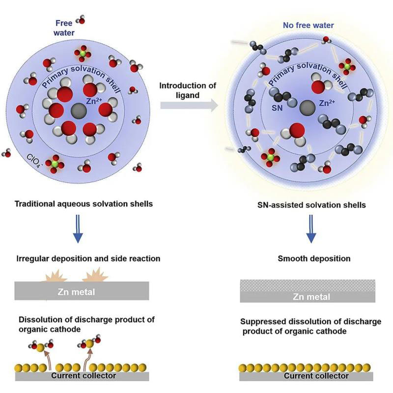 水系鋅-有機(jī)電池由于其豐富的儲(chǔ)量、內(nèi)在的安全性以及低廉的價(jià)格而倍受青睞。近日,中國科學(xué)院青島生物能源與過程研究所的崔光磊研究員,趙井文副研究員和南洋理工大學(xué)的張其春教授合作,采用水合鋅鹽加中性配體的簡單、低成本配方,提出了一種水合熔鹽鋅基電解質(zhì),有效解決了鋅負(fù)極及有機(jī)正極在水系電解質(zhì)中副反應(yīng)和不可逆溶解的問題。相關(guān)成果發(fā)表在Cell Press旗下的能源旗艦期刊Joule上,題為“Hydrated eutectic electrolytes with ligand-oriented solvation shells for long-cycling zinc-organic batteries”。