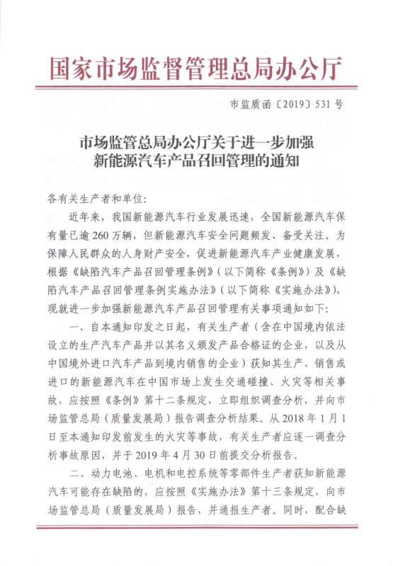 近年來(lái),我國(guó)新能源汽車行業(yè)發(fā)展迅速,但新能源汽車安全問(wèn)題頻發(fā)、備受關(guān)注。為保障人民群眾的人身財(cái)產(chǎn)安全,促進(jìn)新能汽車產(chǎn)業(yè)健康發(fā)展。國(guó)家市場(chǎng)監(jiān)督管理總局于2019年3月15日正式對(duì)外發(fā)布了《關(guān)于進(jìn)一步加強(qiáng)新能源汽車產(chǎn)品召回管理的通知》。