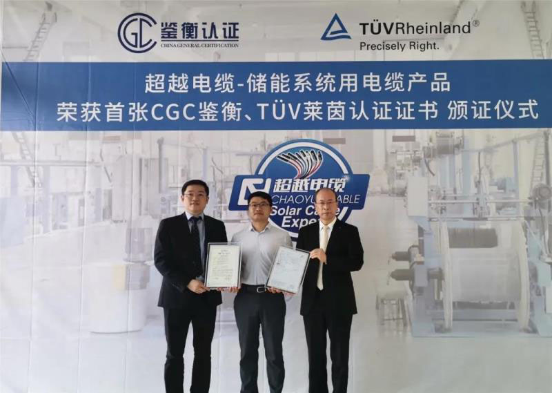 7月7日,CGC北京鑒衡認(rèn)證中心聯(lián)合TüV萊茵共同為常州超越特種電纜有限公司(簡稱:超越電纜)頒發(fā)了儲能系統(tǒng)用電纜認(rèn)證證書。