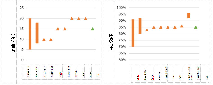 我們選取的壽命為15年,接近已發(fā)布值的中位數(shù)。充放電效率選擇為85%,這與公布的數(shù)值大體一致。