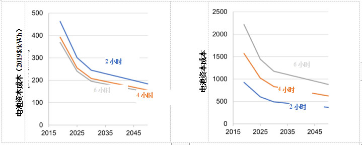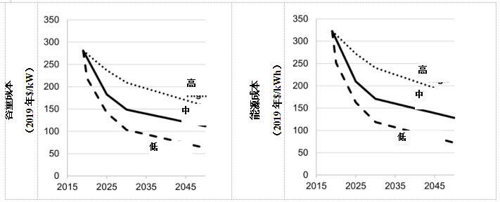圖5.鋰離子系統(tǒng)功率(左)和能量(右)成本的預測