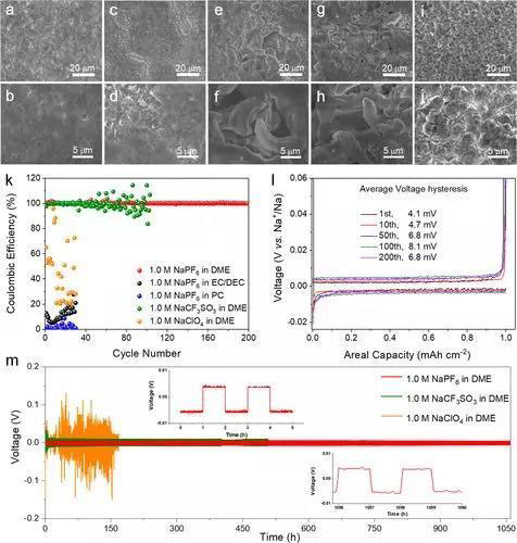 圖2. 電解質(zhì)在鈉陽(yáng)極電鍍/剝離中的作用。在含有(a,b)NaPF6,(c,d)NaCF3O3,(e,f)NaClO4的1.0 M電解液中,以及含有NaPF6/EC/DEC或(i,j)PC溶劑的1.0 M電解液中鍍鈉的掃描電鏡。(k) 庫(kù)侖效率。(l) Na | Cu電池的電壓分布和平均電壓滯后。(m) Na | Na對(duì)稱(chēng)電池的電壓-時(shí)間曲線。