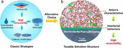 圖1:用于穩(wěn)定鈉金屬陽(yáng)極的策略示意圖。(a) 經(jīng)典策略(包括集電極改性、人工SEI、固體電解質(zhì)和高濃度電解質(zhì))。(b) 本文新策略:可調(diào)溶劑化結(jié)構(gòu)。
