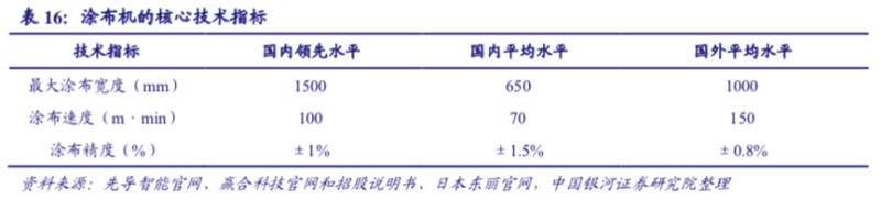 目前,國產(chǎn)廠商在高端涂布設(shè)備領(lǐng)域離日韓企業(yè)還有差距,尚未完成進(jìn)口替代。