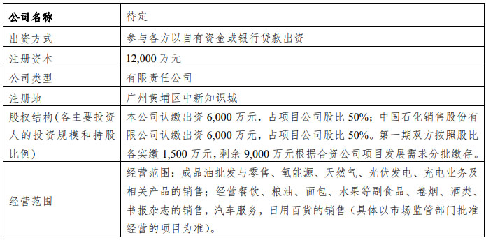 本期項(xiàng)目總投資為 29,789.76 萬(wàn)元。設(shè)立項(xiàng)目公司(待命名),負(fù)責(zé)開(kāi)發(fā)、建設(shè)、運(yùn)營(yíng)該項(xiàng)目。項(xiàng)目公司注冊(cè)資本為 12,000 萬(wàn)元。其中,公司認(rèn)繳出資 6,000 萬(wàn)元,占項(xiàng)目公司股比 50%;中國(guó)石化銷(xiāo)售股份有限公司認(rèn)繳出資 6,000 萬(wàn)元,占項(xiàng)目公司股比 50%。第一期雙方按照股比各實(shí)繳 1,500 萬(wàn)元,剩余 9,000 萬(wàn)元根據(jù)合資公司項(xiàng)目發(fā)展需求分批繳存。