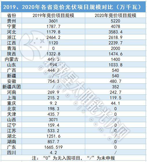 從最終入圍名單來看,26GW的總?cè)萘恳渤^2019年的22.8GW。其中最大規(guī)模為貴州省的5.2GW,此外規(guī)模超過2GW(包括)的省份由2019年的2個(gè)增加到2020年的6個(gè),包括貴州、寧夏、河北、浙江、江西、青海。