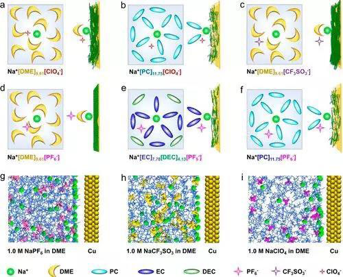 溶劑化殼層中溶劑的排列會影響陰離子的位置,因為不同的Na+溶劑相互作用的結(jié)合能和B值不同。例如,在1.0 M NaPF6/DME的情況下,我們發(fā)現(xiàn)PF6-與Na+具有中等結(jié)合能和較低的B值,因此,當在電解液中使用EC/DEC溶劑時,Na陽極的性能稍差。PC溶劑的表現(xiàn)也與EC/DEC相似。這是因為EC/DEC或PC與Na+的相互作用較弱,因此PF6-陰離子可以很容易地取代EC/DEC或PC,使其更接近Na金屬表面,從而引發(fā)表面反應和腐蝕。相比之下,DME與Na+具有較強的鍵合(即形成五環(huán)絡合物)。因此,DME使PF6-陰離子遠離Na電極表面,從而有效地抑制腐蝕。而DME不能輕易阻止ClO4-和CF3SO3-與Na+結(jié)合。這是因為ClO4-具有高度自由度(即低位阻),而CF3SO3-與Na+有很強的相互作用,這使得這些陰離子很容易遷移。