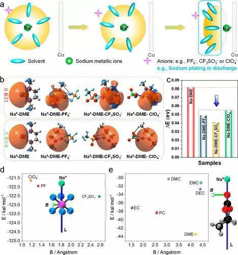 模型預測NaClO4基電解質(zhì)是金屬陽極最差的(即,腐蝕性最強)。這可歸因于Na+和ClO4-之間的結(jié)合能較低,體積小(B值較低,為1.18)。因此,ClO4-可以相當自由地移動,并且更頻繁地到達電極表面。因此,在二甲醚、EC/DEC或PC溶劑中,ClO4-會嚴重腐蝕金屬電極。相比之下,CF3SO3-與Na+有很強的相互作用(結(jié)合能為?122.5 kcal/mol,圖3d),盡管B值(2.58?表示空間位阻)較高;因此,CF3SO3?可能不會自由地向電極移動,因此其腐蝕作用應比ClO4?小。