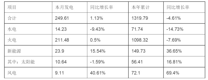 (一)發(fā)電量情況。6月份當(dāng)月,全省發(fā)電量249.61億千瓦時,同比增加1.13%。其中水電14.23億千瓦時,同比減少9.43%;火電211.48億千瓦時,同比增加0.5%;新能源23.9億千瓦時,同比增長15.54%。