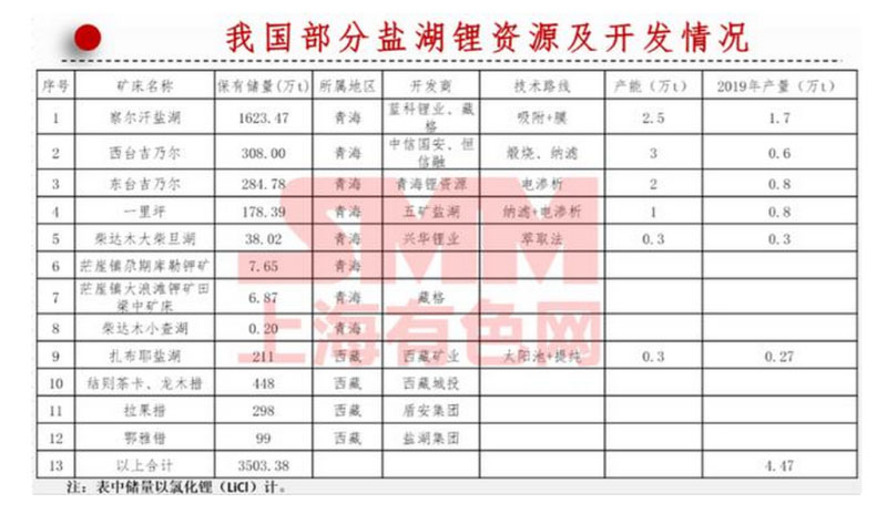 我國(guó)的鋰鹽湖資源主要分布在青海和西藏兩地,其中,青海鹽湖資源中已編入礦產(chǎn)儲(chǔ)量的鋰礦產(chǎn)地10處,保有氯化鋰儲(chǔ)量2447.38萬t。有察爾汗鹽湖及別勒灘礦區(qū)2個(gè)特大型礦床,西臺(tái)、東臺(tái)吉乃爾湖和一里坪礦區(qū)3個(gè)超大型礦床,10個(gè)鹽湖中鋰含量達(dá)到工業(yè)品位的鋰資源892萬t,可供開發(fā)利用。