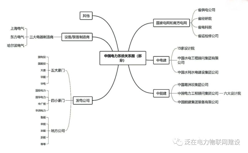 我國電力系統(tǒng)內(nèi)的企業(yè)包括:兩大國網(wǎng)、兩大EPC單位、發(fā)電集團(tuán)(五大+四小+地方)、設(shè)備制造集團(tuán)。其中:
