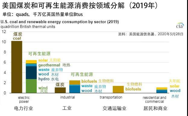 2019年美國煤炭和可再生能源消費按行業(yè)領域分解