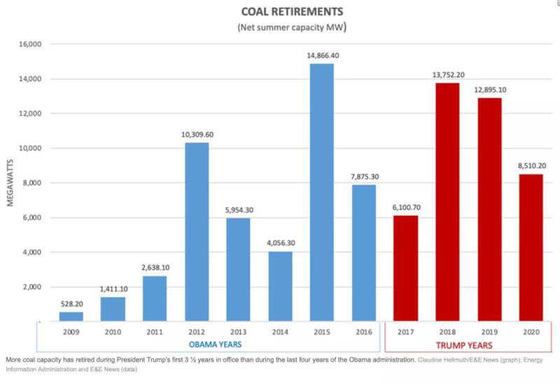 在煤炭退役的數(shù)據(jù)方面,據(jù)美國能源信息署統(tǒng)計,奧巴馬執(zhí)政8年期間有近48GW的煤電退役(其中近33GW是在奧巴馬的第二個任期內退役的)。相比之下,特朗普自2017年進入白宮以來,已經有37GW的煤電退役,另有3.7GW計劃在未來6個月內關閉。2019年美國燃煤電廠發(fā)電量為966TWh,為1976年以來最低。特朗普任期前3年的煤炭業(yè)就業(yè)也基本處于停滯狀態(tài),自今年1月以來已經裁員4500人。