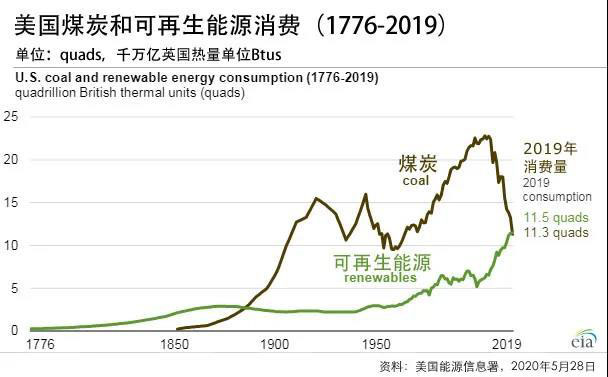 1776-2019年美國煤炭和可再生能源消費變化情況