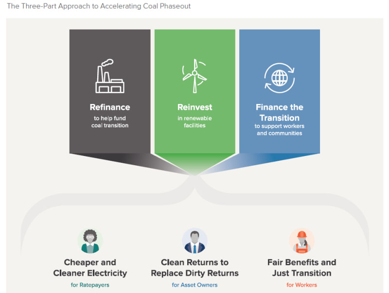 如何加速煤炭的退役,本報告為政府和公共金融機構構建了一套整合方法,包括以下三種形式: