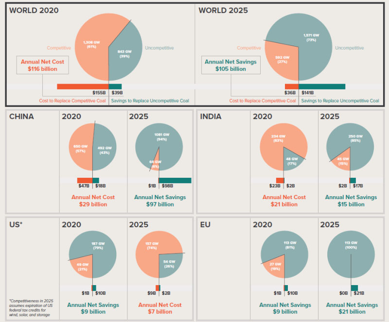 數(shù)據(jù)顯示,到2020年底,用清潔能源替代無競爭力的煤炭,可以為全球的電力客戶節(jié)省390億美元;到2022年可節(jié)省860億美元,為客戶帶來凈成本的節(jié)省。而到了2025年,所節(jié)省的成本進一步上升到1410億美元。