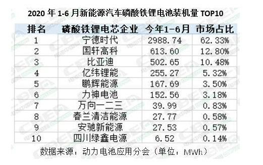 動(dòng)力電池應(yīng)用分會(huì)數(shù)據(jù)顯示,今年1-6月,新能源汽車市場(chǎng)有磷酸鐵鋰配套電池企業(yè)僅有23家,其中寧德時(shí)代、國(guó)軒高科、比亞迪、億緯鋰能、鵬輝能源等前五家電池企業(yè)市場(chǎng)份額已經(jīng)高達(dá)94.43%,前10家企業(yè)更是高達(dá)99.74%。