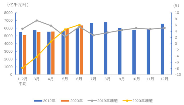 圖1 2019、2020年分月全社會用電量及其增速