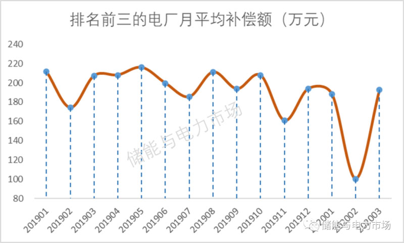浙江嘉華發(fā)電有限公司、華能玉環(huán)發(fā)電廠、浙能蘭溪發(fā)電有限公司、華能玉環(huán)發(fā)電廠、浙江國華浙能發(fā)電有限公司,是獲得補償較多的公司。每月排名前三的電廠月度補償平均值為190萬元。