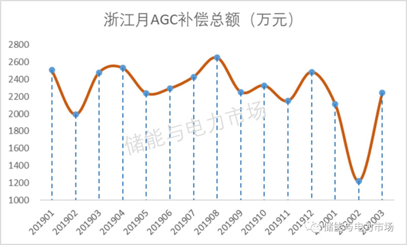 2019年1月-2020年3月間,浙江省的AGC調(diào)頻輔助服務(wù)補償額平均為2262萬元,除個別月份出現(xiàn)比較低的值外,基本穩(wěn)定在2000萬以上,最高為2019年8月,2651萬元。