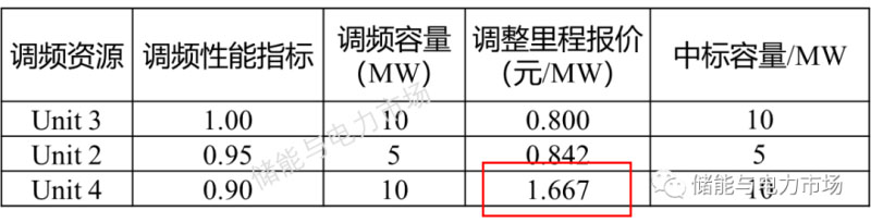 上圖中,unit2、unit3、unit4中標,根據(jù)這幾個中標機組的調(diào)整里程報價從低到高進行排序,最高的調(diào)整里程報價為市場里程出清價格。