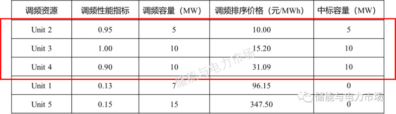 排序價格確定后,根據(jù)市場調(diào)頻需量確定邊際機組。如市場需量為25MW,則下圖中邊際機組為unit4。