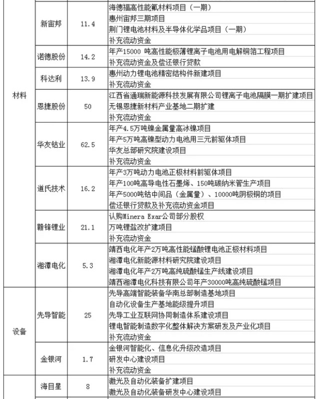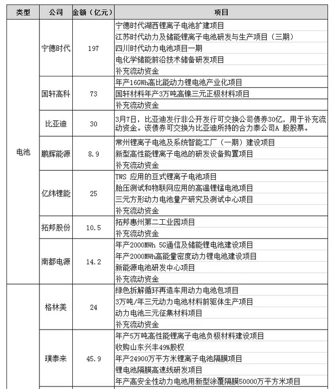 4、重視研發(fā)儲備與技術(shù)升維。除了擴(kuò)產(chǎn)并購?fù)?,包括寧德時代、先導(dǎo)智能、鵬輝能源、璞泰來、華友鈷業(yè)等企業(yè)均在募集資金用于前沿技術(shù)研發(fā)項目。