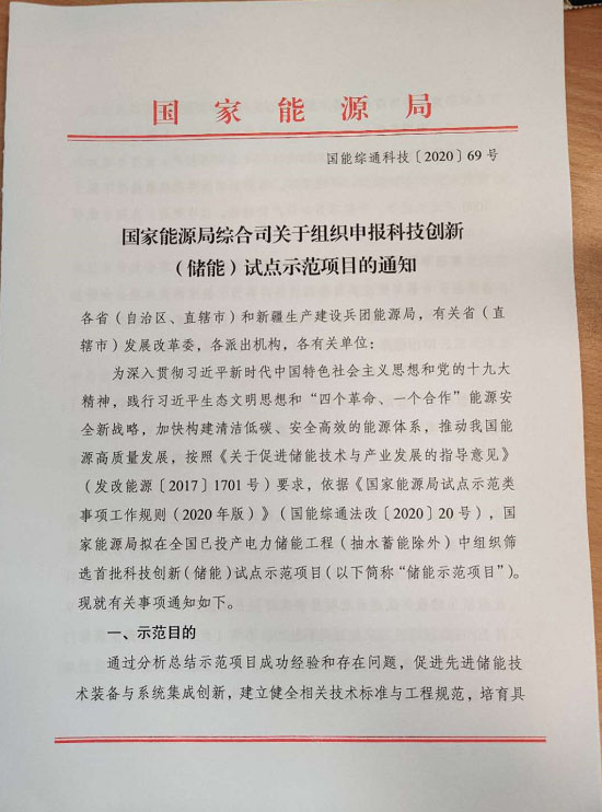 國家能源局綜合司關于組織申報科技創(chuàng)新(儲能)試點示范項目的通知