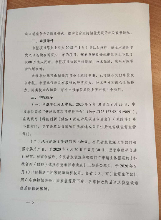 (一)申報單位網(wǎng)上申報。2020年8月10日至8月23日,申報單位登錄“儲能示范項目申報平臺”(http://123.127.52.151:9091);在線填寫《科技創(chuàng)新(儲能)試點示范項目申請表》(見附件)并下載打印,簽字蓋章后報送項目所在地或公司注冊地省級能源主管部門。