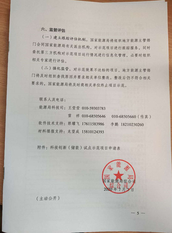 (四)公示與確認。國家能源局對推薦項目名單進行審核,并在官網(wǎng)公示。公示無異議的,正式發(fā)文確認國家能源局科技創(chuàng)新(儲能)試點示范項目。