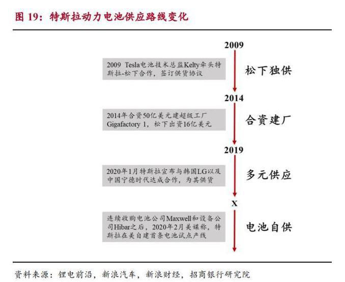 二線企業(yè)仍蘊藏生機,未來有望形成一超多強的格局。作為新能源汽車行 業(yè)的領(lǐng)軍企業(yè),特斯拉對動力電池供應(yīng)商的選擇經(jīng)歷四個階段:(1)松下獨 供:發(fā)展初期,特斯拉從技術(shù)與品質(zhì)優(yōu)先的角度出發(fā),選擇松下作為其唯一的 供應(yīng)商;(2)合資建廠:發(fā)展中期,特斯拉動力電池需求旺盛,與松下合資 建立超級工廠,形成深度綁定關(guān)系;(3)多元供應(yīng):產(chǎn)能爬坡期,與松下關(guān) 于產(chǎn)能擴建與電池成本等方面矛盾凸顯,特斯拉從成本、品質(zhì)、規(guī)模優(yōu)先的角 度引入 LG 和寧德時代;(4)電池自供:隨著 2019 年先后收購電池公司 Maxwell 和電池設(shè)備公司 Hibar,2020 年 2 月自建電池試點產(chǎn)線,未來特斯拉 電池自供的規(guī)劃逐漸清晰。其他新能源汽車企業(yè)對動力電池供應(yīng)商的選擇,大 概率也會經(jīng)歷上述四個階段,屆時對動力電池的格局有著較大的影響。