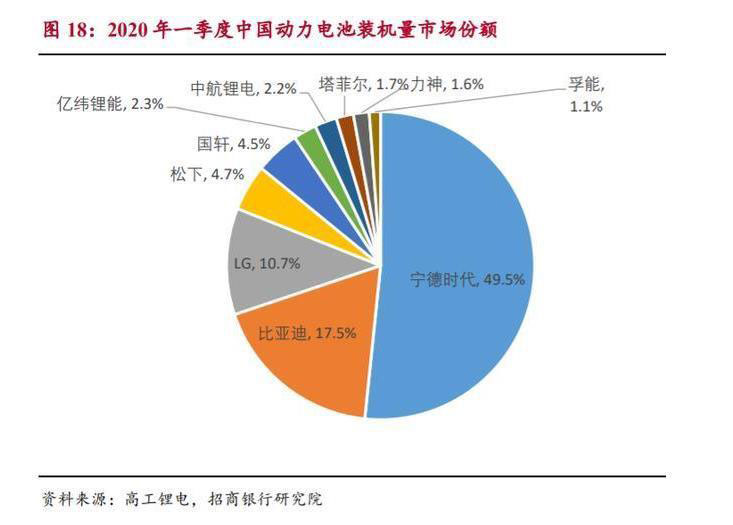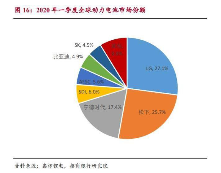 LG 占比有望繼續(xù)提升。2020 年 Q1,LG、松下、寧德時代、比亞迪全球 市場占有率分別為 27.1%、25.7%、17.4%、4.9%。LG 占有率同比增速達 153.3%,增長迅猛;松下維持其一貫的穩(wěn)健風(fēng)格,排名仍為第二,市占有率同 比小幅增長;國內(nèi)企業(yè)寧德時代、比亞迪分別位列第三、第六,下滑顯著。這 主要是由于一季度受疫情影響,國內(nèi)的新能源汽車市場跌入谷底。而歐美疫情 爆發(fā)較晚,一季度受影響較小,新能源汽車市場還出現(xiàn)一定程度的增長。