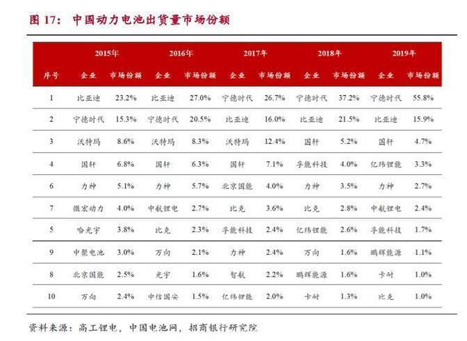 集中度逐年提升,龍頭企業(yè)優(yōu)勢顯著。2018 年、2019 年 CR10 市場份額分 別為 81.3%、89.7%,行業(yè)集中度持續(xù)提升。2019 年寧德時代市場份額高達 55.8%,占比首次過半,同比增速達 50.1%, 增幅顯著;比亞迪市場份額為 15.9%,同比下滑 26.1%。與此同時,二線企業(yè)生存空間明顯壓縮,2018 年底 國內(nèi)動力電池企業(yè)還剩 90 多家,而 2020 年有電池裝機的動力電池企業(yè)只剩 38 家,行業(yè)洗牌加劇。2019 年 TOP10 企業(yè)中,除了寧德時代,只有億緯鋰能 和中航鋰電兩家市場份額呈正增長,剩下的 7 家企業(yè)均出現(xiàn)不同程度的下滑, 除了國軒下滑 9.2%,其余 6 家降幅均在 20%以上,降幅顯著。