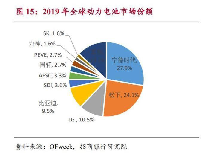 日韓企業(yè)發(fā)力,占比顯著提升。2018 年和 2019 年 CR10 分別為 81.2%、 88.9%,行業(yè)集中度持續(xù)提升,行業(yè)競爭趨于激烈。從主要國家來看,TOP10 全部來自中日韓三國。2019 年 TOP10 市場占比中,中日韓占比分別 41.8%、 31.4%、17.3%,中國市場份額呈下滑趨勢,日韓呈上升趨勢。主要是由于中 國電池企業(yè)對國內(nèi)市場依賴度較高,海外市場表現(xiàn)較佳的寧德時代, 2019 年 的電池出口額僅占營收的 5.6%。近兩年隨著歐美新能源汽車市場的快速增長, 與其深度綁定的日韓企業(yè)得到了迅速發(fā)展。從動力電池企業(yè)來看,2019 年頭 部企業(yè)寧德時代及松下競爭優(yōu)勢明顯,合計占比達 52%。但 LG 增長較快,位列第三,同比增速達 39.7%。國內(nèi)企業(yè)除寧德時代之外,整體下滑明顯,其中 比亞迪跌出前三,市占率同比下滑 27.9%,降幅顯著。