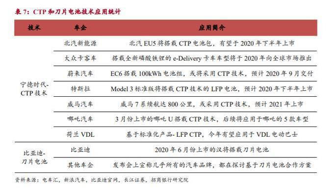 助力龍頭企業(yè)筑造技術(shù)壁壘,鞏固行業(yè)定位,拓展海外市場。寧德時代 CTP 技術(shù)知識產(chǎn)權(quán)超過 200 項,比亞迪刀片電池技術(shù)核心專利超過 300 項,兩 者均為龍頭企業(yè)筑造了較高的技術(shù)壁壘。寧德時代 CTP 技術(shù)有“無模組”和“大 模組” 兩種方案,其中“大模組”方案對車型的適配度較高。據(jù)不完全統(tǒng)計,國 內(nèi)下半年有 5 款搭載 CTP 技術(shù)的車型上市,其中不乏明星車型 Model3 和蔚來 EC6 等,屆時有助于寧德時代進一步提高國內(nèi)市場占有率。同時基于 CTP 技 術(shù)的磷酸鐵鋰電池在大眾卡客車型和荷蘭 VDL 車型上的應(yīng)用,將有助于寧德 時代拓展海外市場。而比亞迪刀片電池技術(shù)有助于發(fā)揮其磷酸鐵鋰龍頭企業(yè)的 優(yōu)勢,助力其挖掘新的國內(nèi)外動力電池客戶。