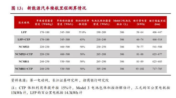 助力磷酸鐵鋰回暖,提升新能源汽車產(chǎn)品力。為了衡量 CTP 技術(shù)(刀片技 術(shù))對新能源汽車行業(yè)的影響,我們以 Model 3 為樣車,測算了不同技術(shù)路線 搭配 CTP 技術(shù)之后車輛的續(xù)航里程。測試結(jié)果顯示:(1)CTP 技術(shù)可以將磷 酸鐵鋰電池包的能量密度提升至傳統(tǒng)中鎳電池包水平,有利于彌補磷酸鐵鋰能 量密度較低的缺陷,拓展其在低續(xù)航乘用車領(lǐng)域的應(yīng)用空間。但 CTP 技術(shù)本 質(zhì)上是結(jié)構(gòu)創(chuàng)新,不改材料端本身的劣勢,預(yù)期中長期乘用車領(lǐng)域仍以三元為主;(2)CTP 技術(shù)有望在現(xiàn)有基礎(chǔ)上,提升新能源汽車的續(xù)航里程。采用 NCM811-CTP 技術(shù)的新能源汽車續(xù)航里程可以達到 785km,有望徹底解決里 程焦慮,進而提升產(chǎn)品力,助力新能源汽車滲透率的提升。此外,目前在電池 技術(shù)領(lǐng)域,國內(nèi)新能源汽車與特斯拉的主要差距在系統(tǒng)集成方面,CTP 和刀片 技術(shù)有助于縮短兩者的差距,利好國內(nèi)新能源汽車的發(fā)展。