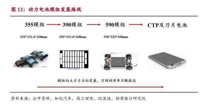 模組技術(shù)往大尺寸方向發(fā)展。新能源汽車初期階段,大部分底盤是油改電 平臺,其裝載的電池空間各不相同,導(dǎo)致對模組和電芯尺寸需求各不相同,而 電芯尺寸種類較多的劣勢顯著。隨著德國汽車工業(yè)協(xié)會推出電池 VDA 標準尺 寸,大眾推出 VDA 標準 355 模組,模組集成走向標準化的道路。隨著新能源 汽車發(fā)展的深入,各車企陸續(xù)推出基于電動化的整車平臺,裝載電池的底盤空 間有所增大和形狀更加規(guī)整,模組集成往大尺寸和高容量方向發(fā)展,空間利用 率和成組效率不斷提高。伴隨著電池模組越來越大的趨勢,寧德時代和比亞迪 分別推出了 CTP、刀片電池技術(shù)。