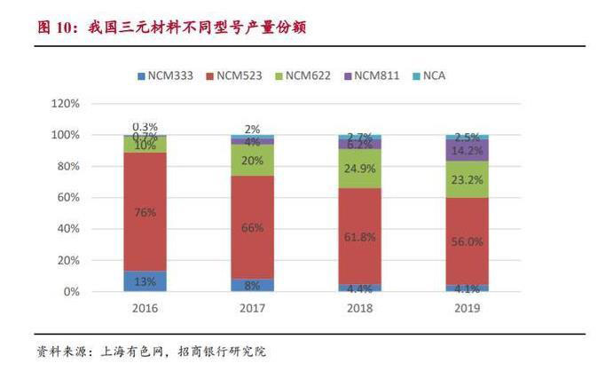 未來高鎳三元仍是主流。雖然磷酸鐵鋰占比有所回暖,但 2020 年工信部第 一批乘用車推薦目錄中仍有 82%的車型搭配三元電池,在乘用車領(lǐng)域三元仍占 主導(dǎo)地位。從三元產(chǎn)品結(jié)構(gòu)來看,高鎳化趨勢顯著。當前國內(nèi)三元市場以中鎳 三元為主,其中市場份額最大的 NCM523 呈現(xiàn)下滑的趨勢。而低鎳三元由于 能量密度較低,成本優(yōu)勢下降,市場份額逐年被壓縮。相反,高鎳 NCM811 占比持續(xù)增加,2019 年市場份額同比增速達 129%,增幅顯著。NCM622 由于 與 NCM523 差異較小,部分企業(yè)會越過 NCM622,直接升級至 NCM811,預(yù) 計其占比有望維持在 23%左右。對于 NCA,由于國內(nèi)企業(yè)一直無法突破其較 高的技術(shù)壁壘,在國內(nèi)市場的份額占比較低。但隨著外資動力電池企業(yè)的進入 和 Model 3 產(chǎn)能的釋放,其占比有望進一步提升。