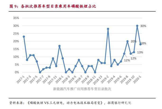 補貼退坡,助力磷酸鐵鋰呈現(xiàn)回暖趨勢 。2019 年 6 月份補貼退坡以來,整 車企業(yè)對動力電池成本要求更高,磷酸鐵鋰由于成本方面的優(yōu)勢,在低續(xù)航 (≤400km)乘用車和專用車上的搭載率有所提升。工信部新能源汽車推薦目 錄顯示,2019 年下半年搭載磷酸鐵鋰電池的車型占比明顯提升,連續(xù) 6 批占 比達 10%以上,占比平均值為 17%,遠高于 2018 年的 4%,下半年磷酸鐵鋰 呈回暖趨勢。