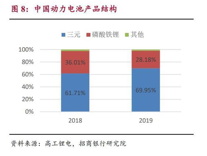 動力電池領(lǐng)域產(chǎn)品結(jié)構(gòu):三元為主、磷酸鐵鋰為輔。新能源汽車產(chǎn)品結(jié)構(gòu) 中乘用車占主導(dǎo)地位,2019 年乘用車、客車、專用車的占比分別為 88.06%、 7.88%、4.06%,乘用車市占率相較 2018 年提升了 4.22 pct,呈上升趨勢。受益 于下游新能源汽車產(chǎn)品結(jié)構(gòu),在政策補貼助力之下,動力電池領(lǐng)域形成了三元 為主,磷酸鐵鋰為輔的產(chǎn)品結(jié)構(gòu)。2019 年三元和磷酸鐵鋰的占比分別為 69.96%、28.18%,磷酸鐵鋰的占比不足三分之一。