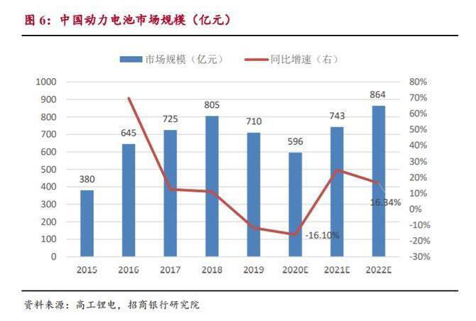 市場規(guī)模短期波動,未來仍有一定的增量空間。2019 年受限于新能源汽 車市場疲軟,動力電池市場規(guī)模有所收縮,總市場規(guī)模為 710 億元,同比下滑 11.80%。從新能源汽車銷量、單車帶電量和動力電池售價三個維度出發(fā),預(yù)計 2020 年動力電池市場規(guī)模約為 596 億元,同比增長率為-16.10%。后續(xù)隨著新 能源汽車市場的回暖,預(yù)計 2022 年市場規(guī)模有望達到 860 億元,未來 2 年復(fù) 合增長率約為 20%,仍有一定的增量空間。