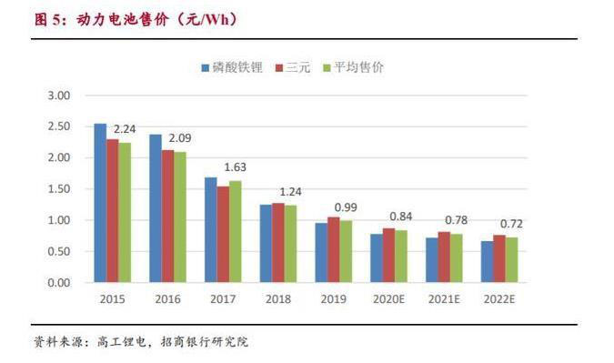 在下游整車平價訴求、上游原材料成本下降和自身制造成本下降三個維度 助力之下,動力電池售價呈現(xiàn)逐年明顯下降走勢。2019 年動力電池平均售價 為 0.99 元/Wh,同比下降 19.93%,降幅有所收窄。預(yù)計 2020 年三元、磷酸鐵 鋰電池的售價分別為 0.87、0.78 元/Wh,粗略預(yù)估動力電池平均售價為 0.84 元 /Wh 左右,同比下降 15.25%??紤]到上游原材料成本下降速率有限,預(yù)計 2022 年三元、磷酸鐵鋰電池的售價分別為 0.76、0.66 元/Wh,粗略預(yù)估動力電 池平均售價約為 0.72 元/Wh,未來 2 年的年復(fù)合增長率為-9.93%。屆時,新能 源汽車與傳統(tǒng)燃油車購車成本進一步縮小,有望于 2025 年實現(xiàn)基本平價。
